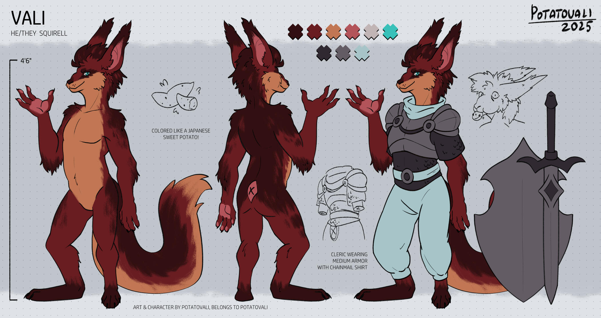 Vali, my mascot! He's a squirrel and he was briefly based on a red potato hence the red/warm coloring. He's a cleric in a metal plate armor with chain mail, equipped with a sword and a simple shield.