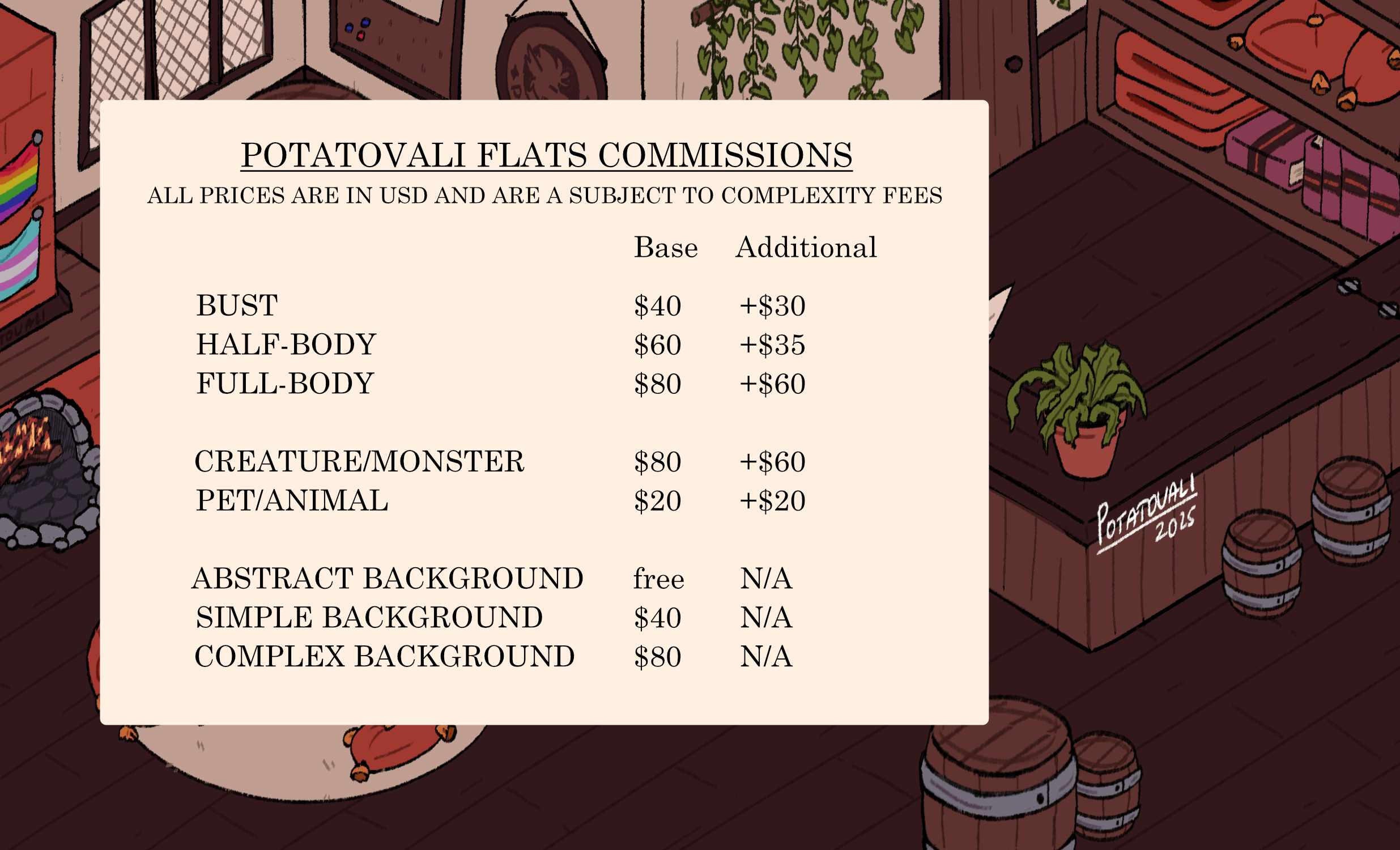 $20 per | +$15USD per additional character | +$20~$40USD to animate |